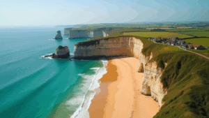 Beach Travel Destinations > drone-view-of-a-stunning-sandy-beach-with-turquoise-water-and-rugged-coastline-in-england