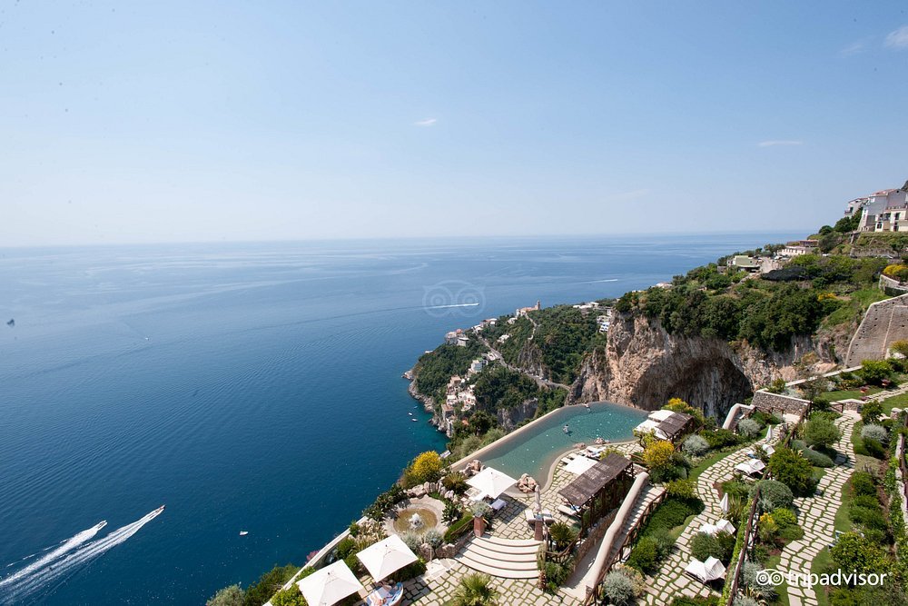 Set high above the sea, Monastero Santa Rosa is a quiet luxury retreat in an old monastery. The property feels calm and private, with terraced gardens overlooking the water. One of its main features is the infinity pool, which blends into the sea below. Guests also enjoy a spa and calm spaces made for rest. Overall, the mood feels intimate, elegant, and romantic.